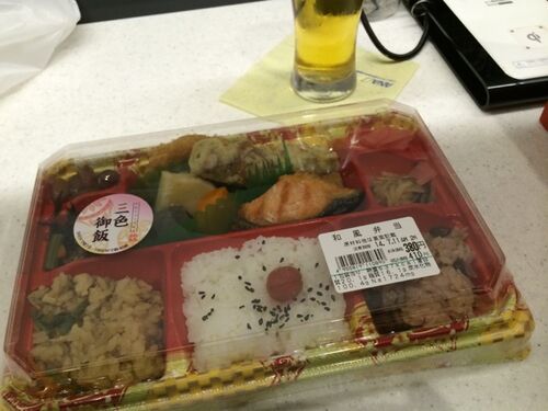 伯父とお別れをし、予定通り帰鹿です。 空港で、380円弁当。 税込で410円だ!